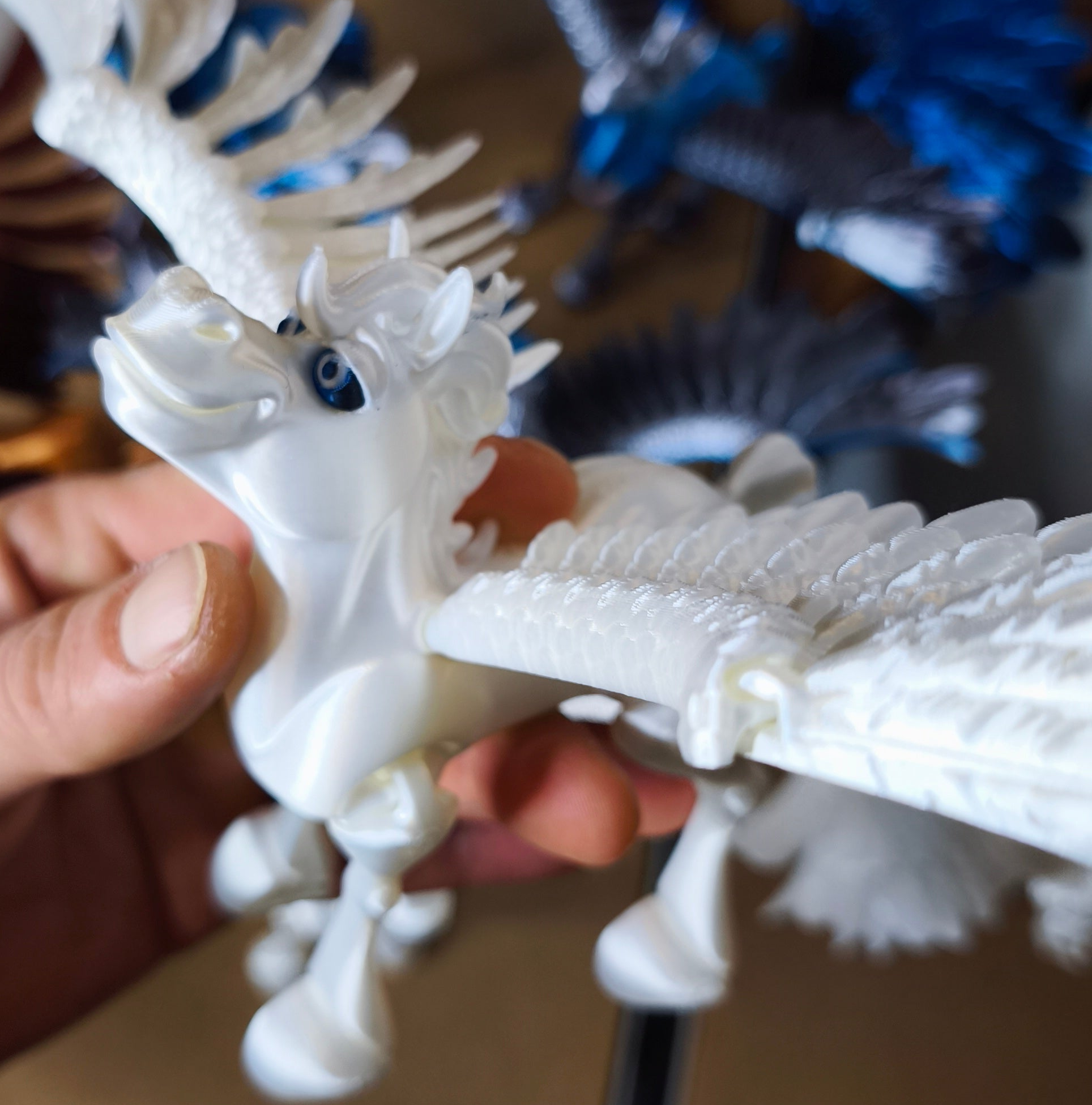 Die Figur wird im 3D-Druck aus PLA gefertigt und in meiner Werkstatt im Allgäu sorgfältig von Hand nachbearbeitet. Dank der beweglichen Elemente und der offenen Flügelhaltung erhält der Pegasus eine lebendige Ausstrahlung, die aus jedem Blickwinkel überzeugt.