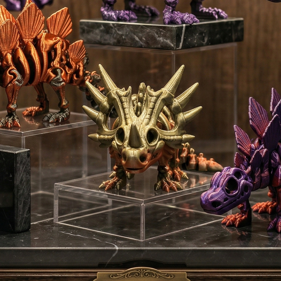 Bei Silk-, Dual-, Tri- und 4-Color-Filamenten sowie Rainbow-PLA variieren Farbverläufe und Farbverteilung von Charge zu Charge und von Exemplar zu Exemplar. Das Produktfoto zeigt ein repräsentatives Beispiel – dein Styracosaurus wird in Farbe und Verlauf einzigartig sein und vom Foto abweichen. Genau das macht ihn zum Unikat.